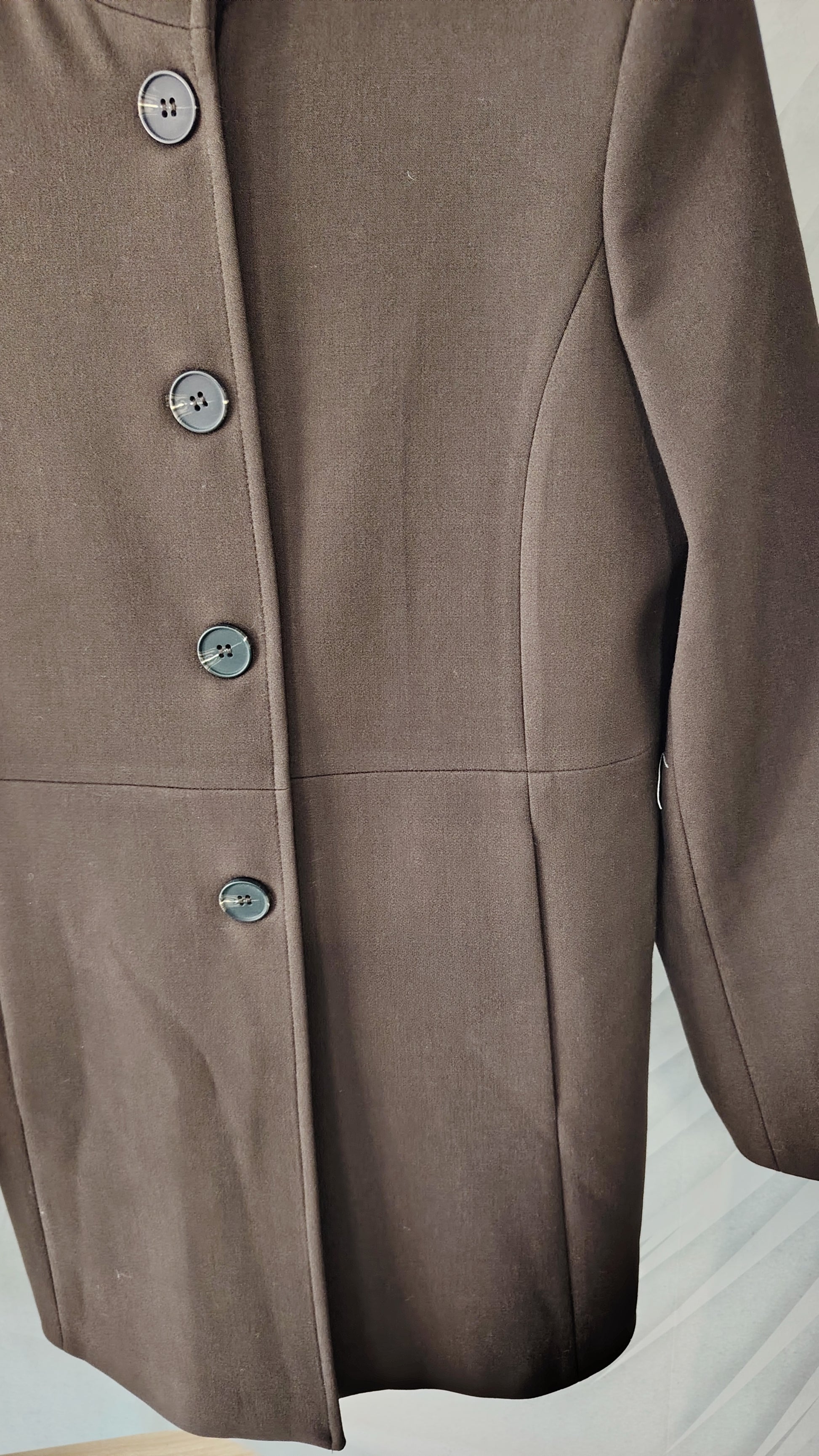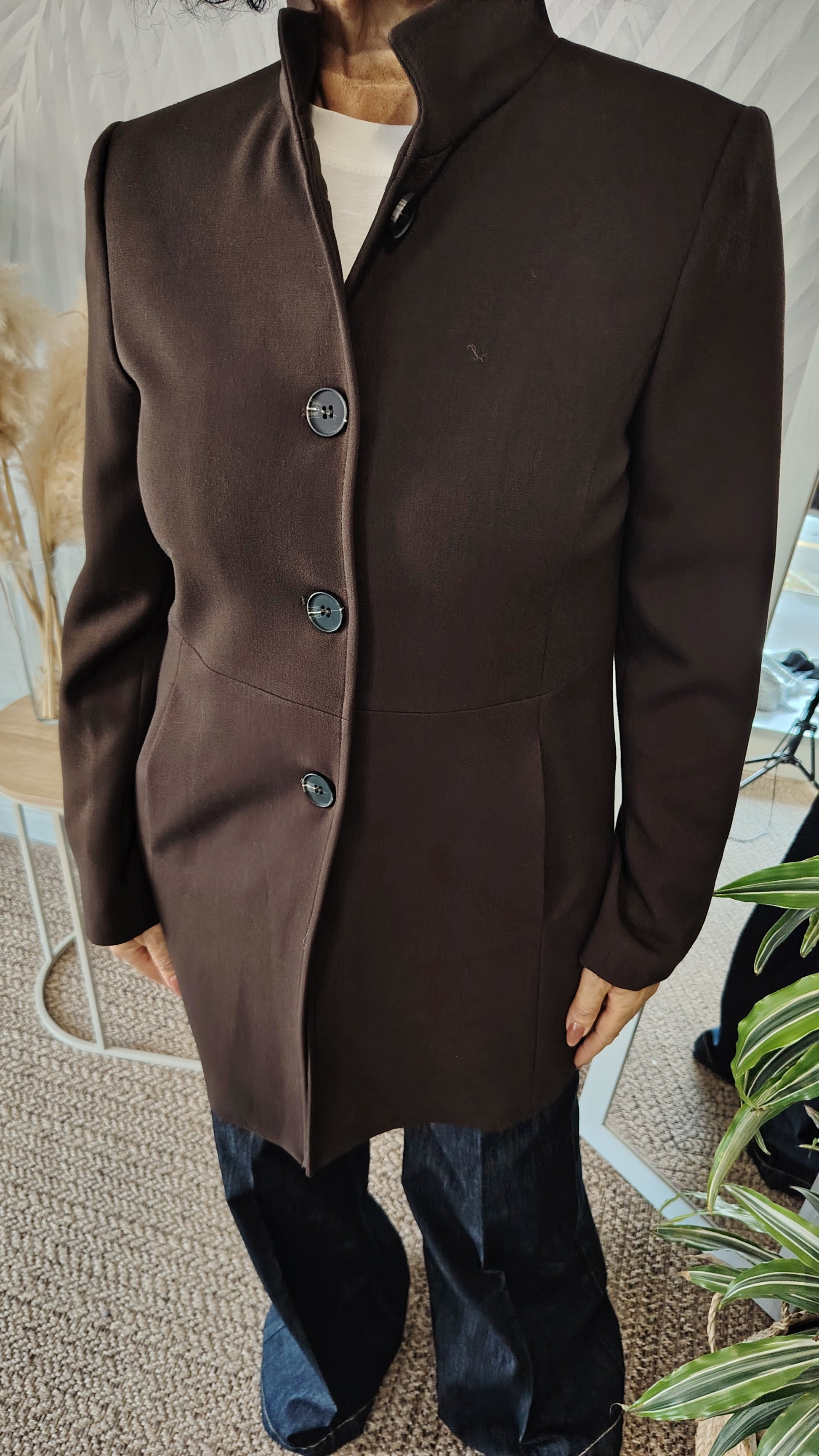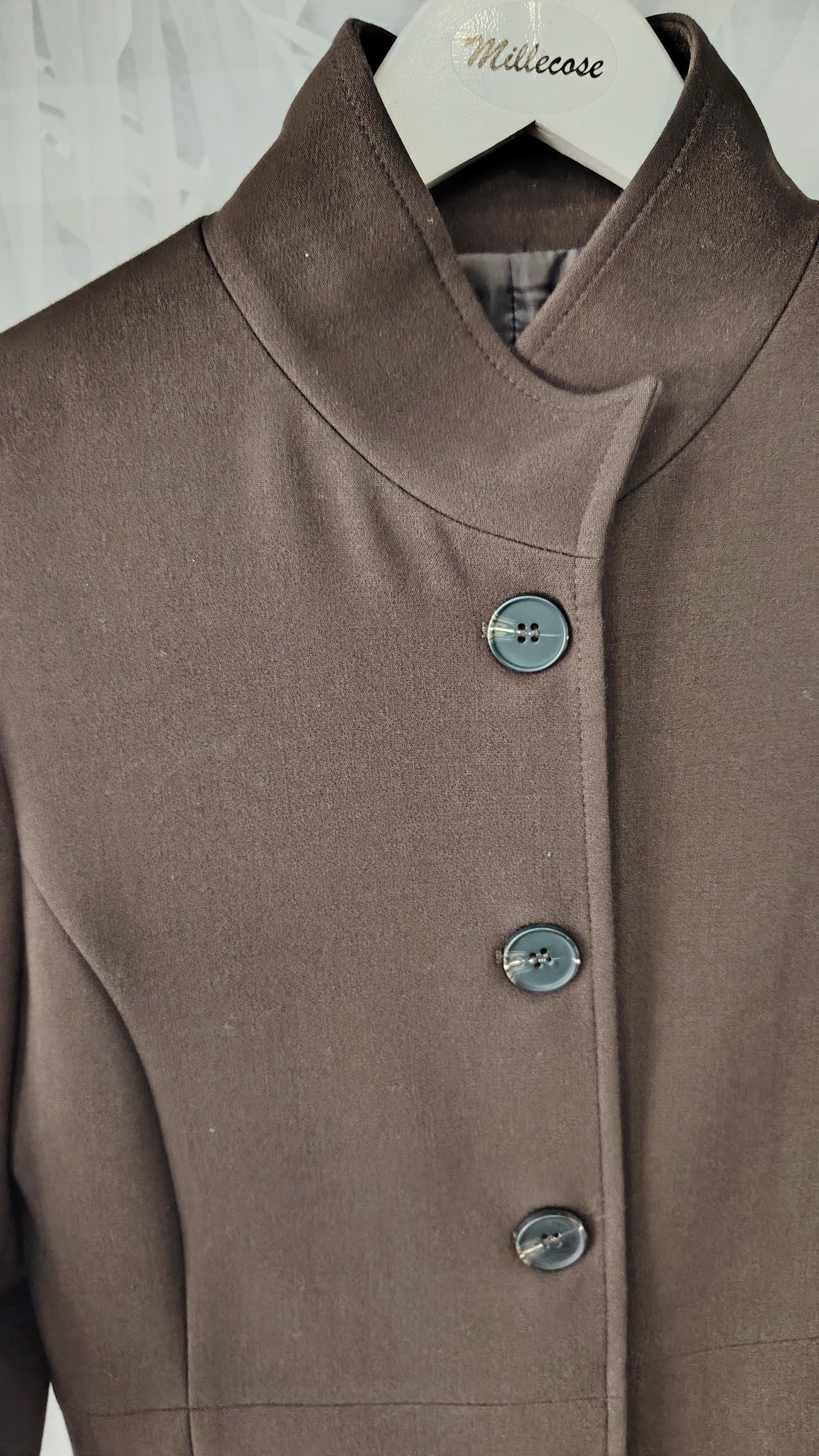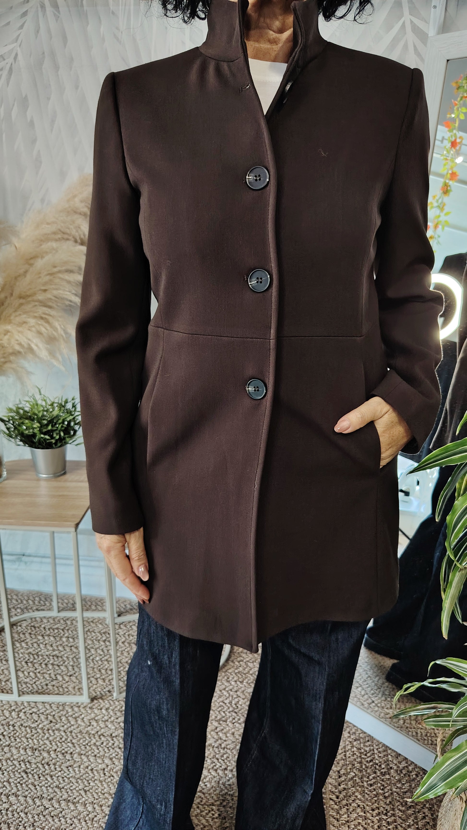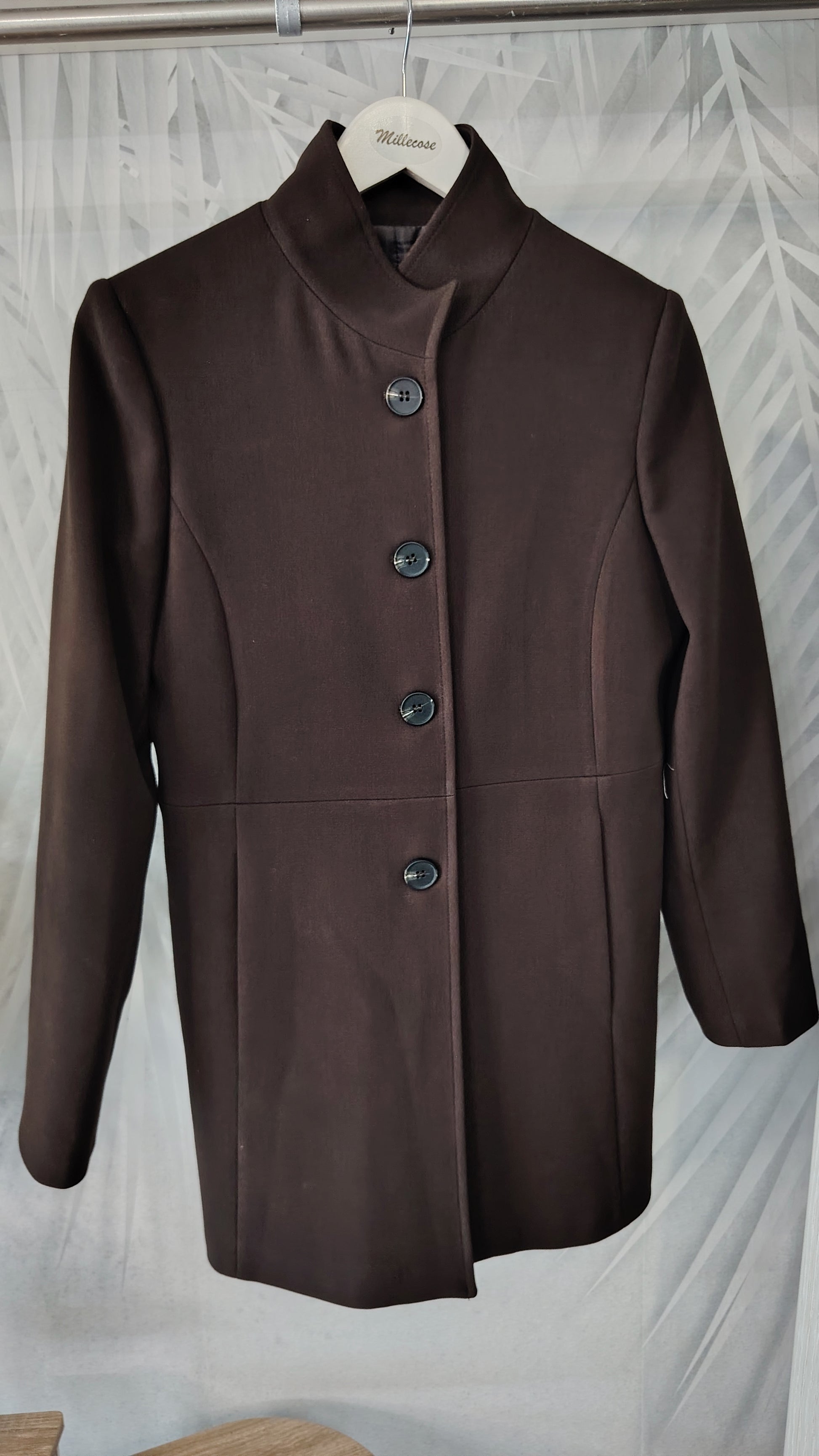 Cappottino medio peso , bottoni sul davanti, collo alla coreana , sfiancato , spacco posteriore , foderato , spalline imbottite
