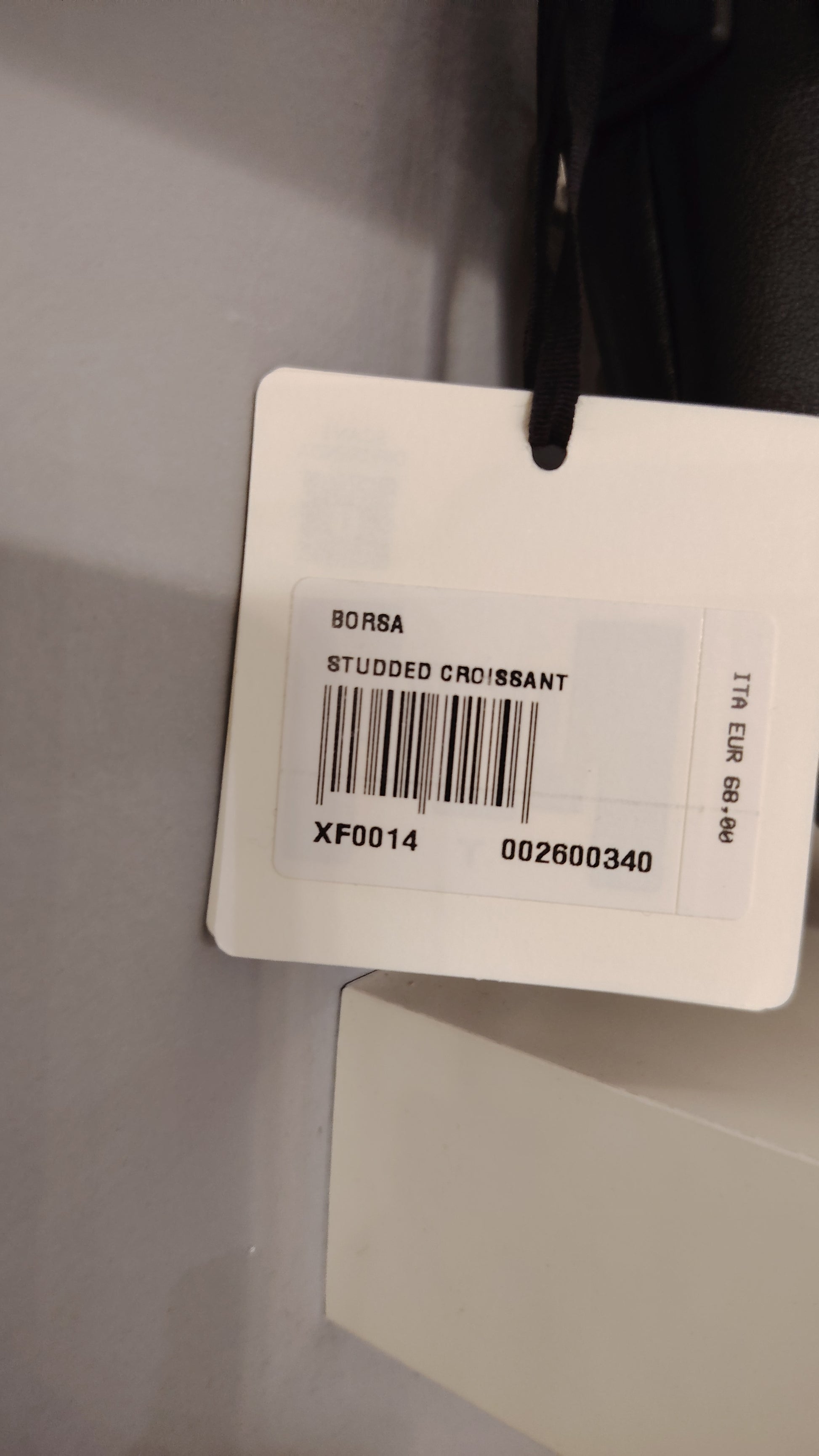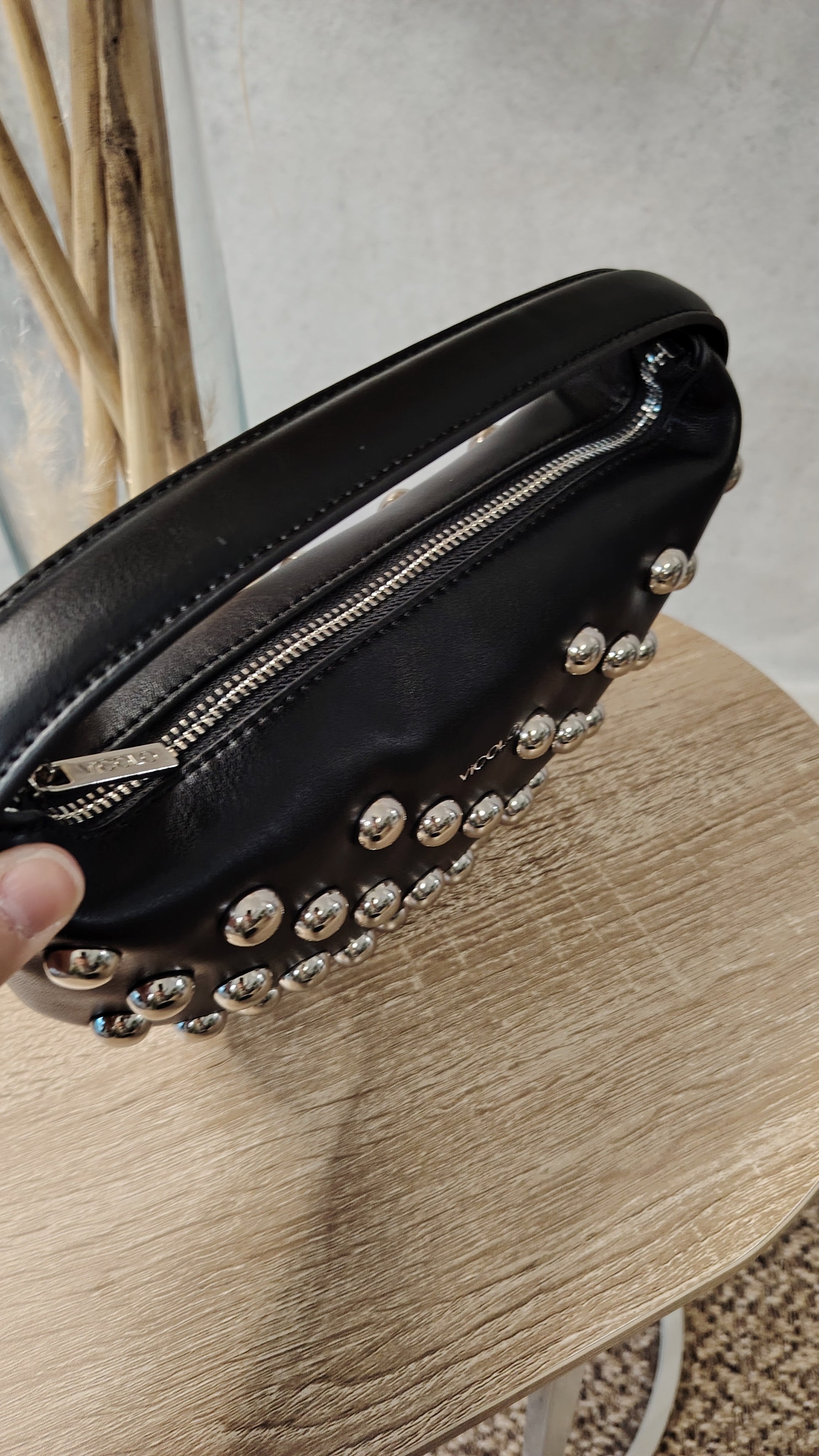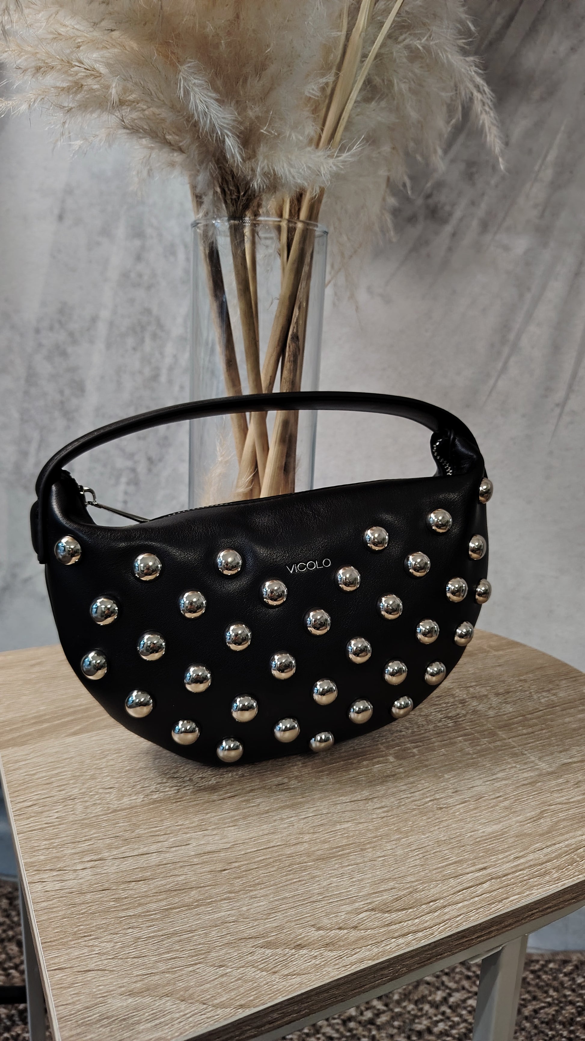 Borsa Croissant a mano in ecopelle con borchie in metallo lucido applicate. Chiusura con cerniera. Dettaglio logo Vicolo laserato. Finiture anticate color argento. Tasca interna con cerniera e taschina piatta.