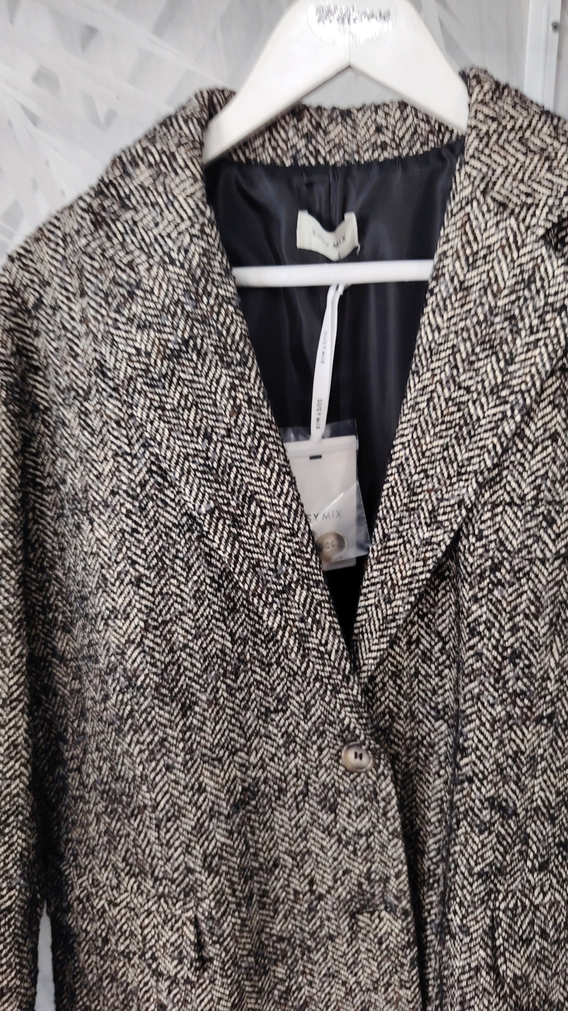 Giacca cappotto over tessuto spinato, due bottoni , pattine sulle tasche , spacchi posteriori