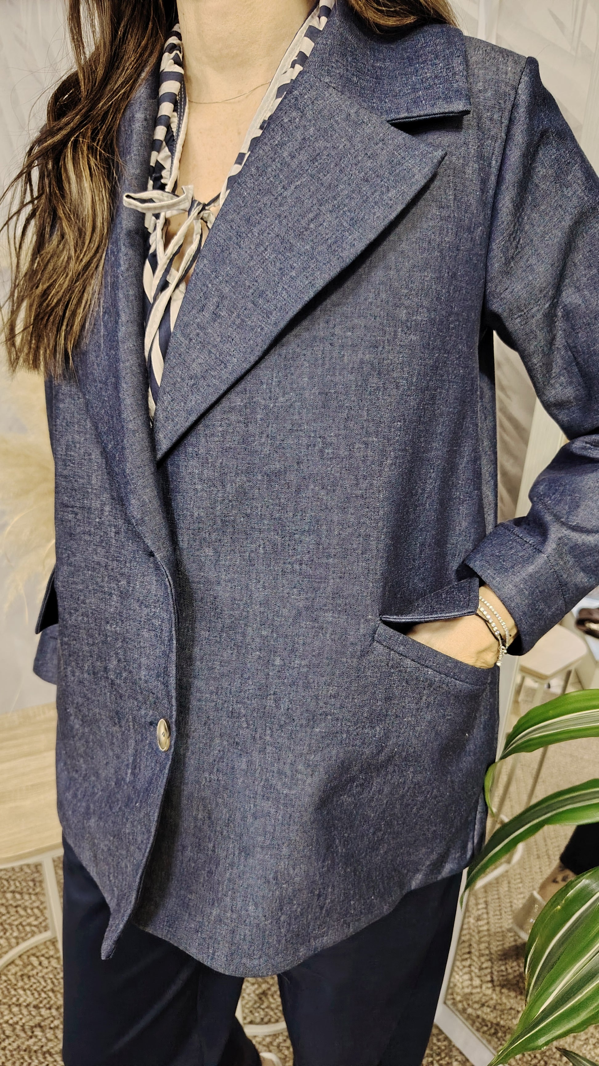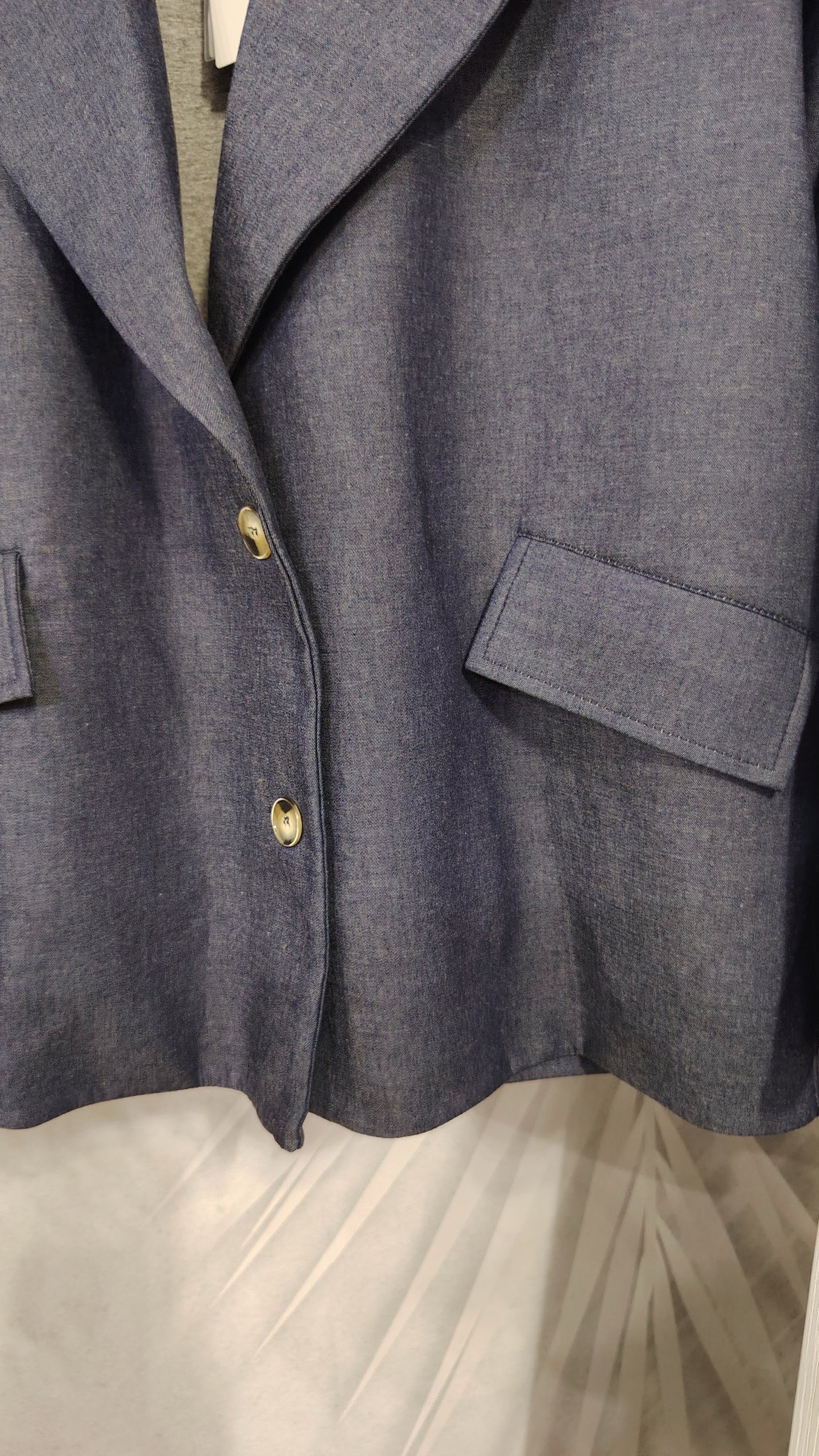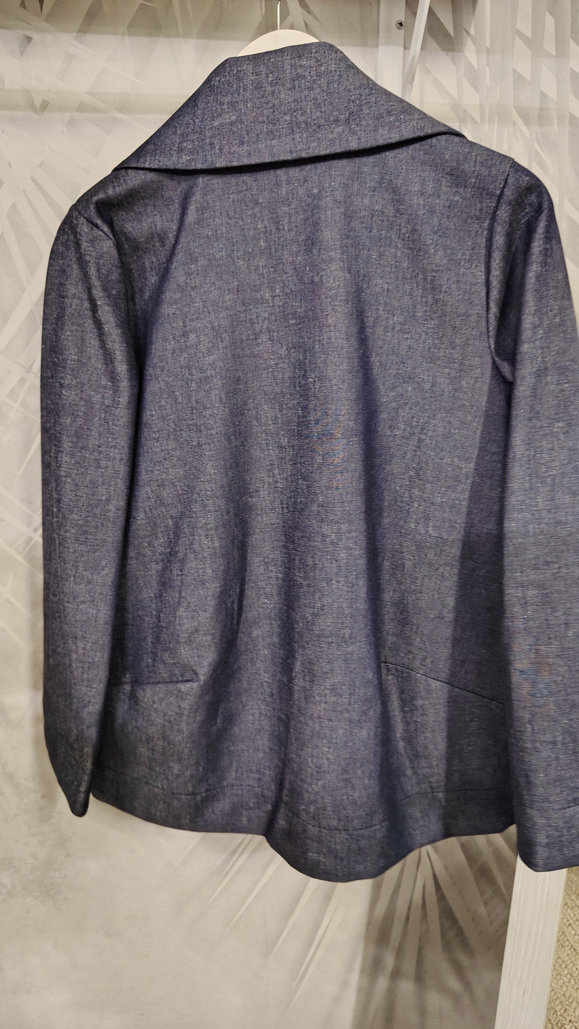 Giacca in neoprene con effetto denim, tasche con pattina , due bottoni , collo sciallato