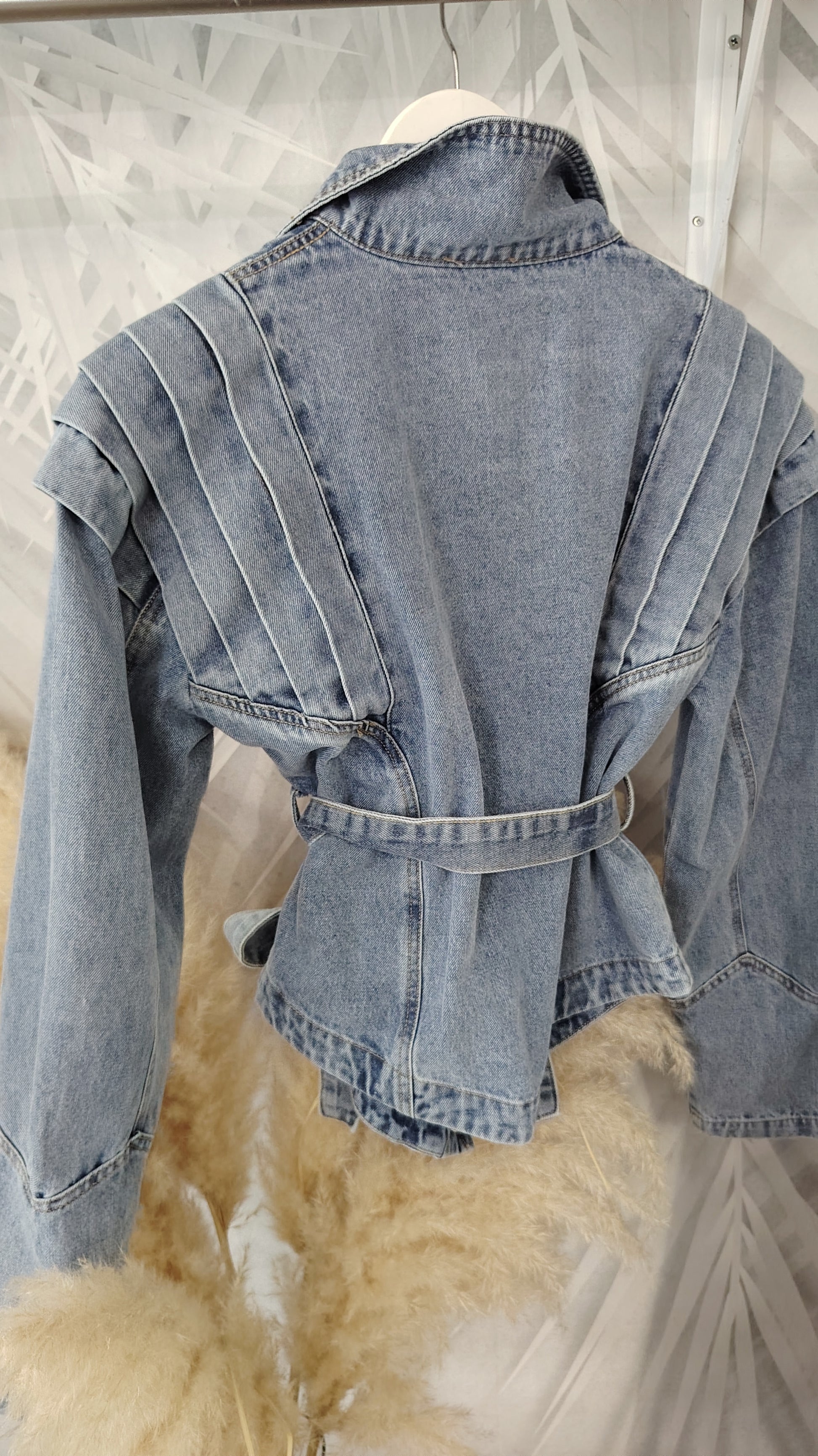 Giubbotto in denim elasticizzato con un bottone e cintura , motivo di pieghe sul giro maniche, collo a rever