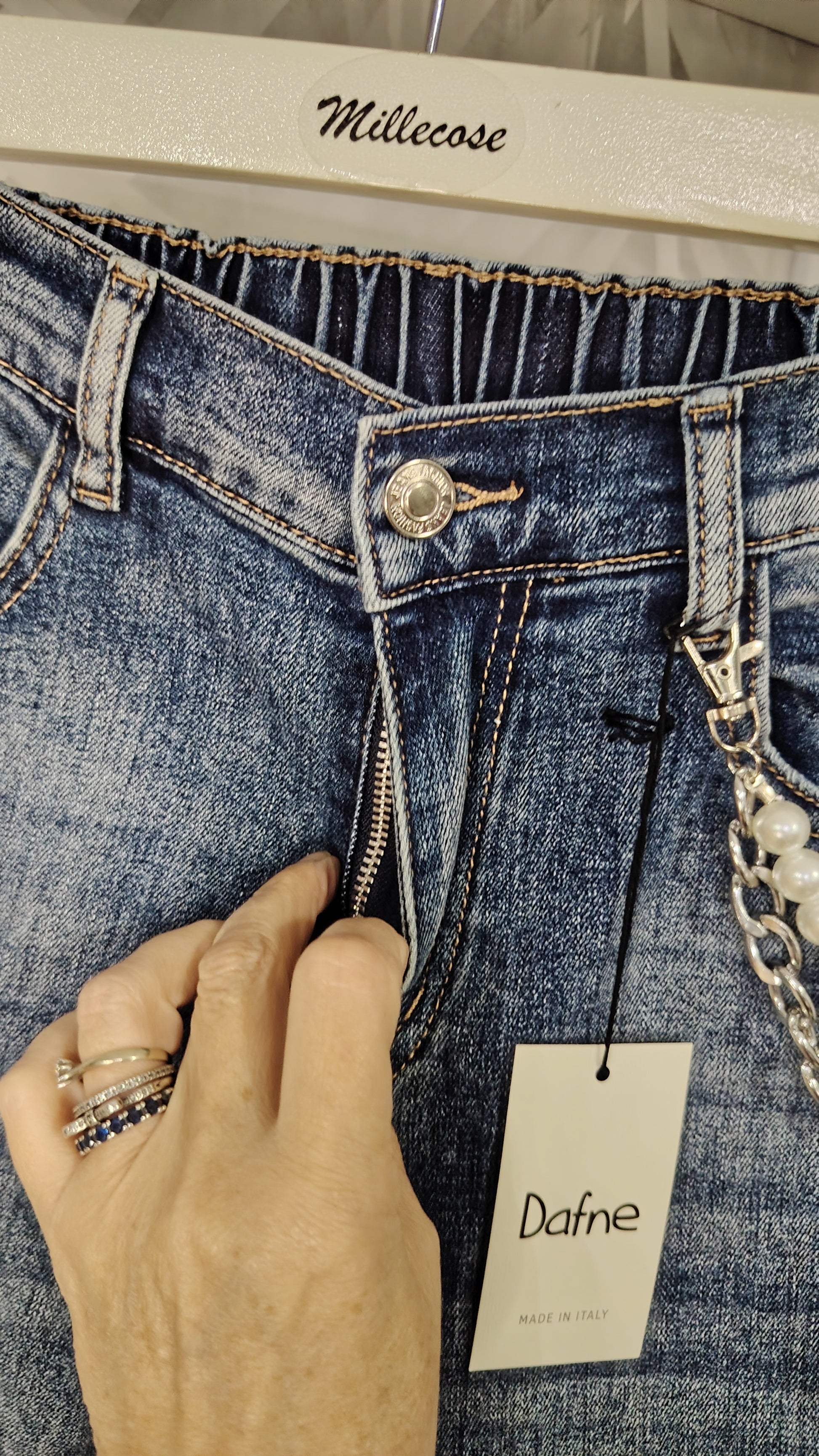 Jeans baggy, cinque tasche, cerniera e bottone, cinturino elasticato sul dietro , tessuto elasticizzato, lavaggio medio