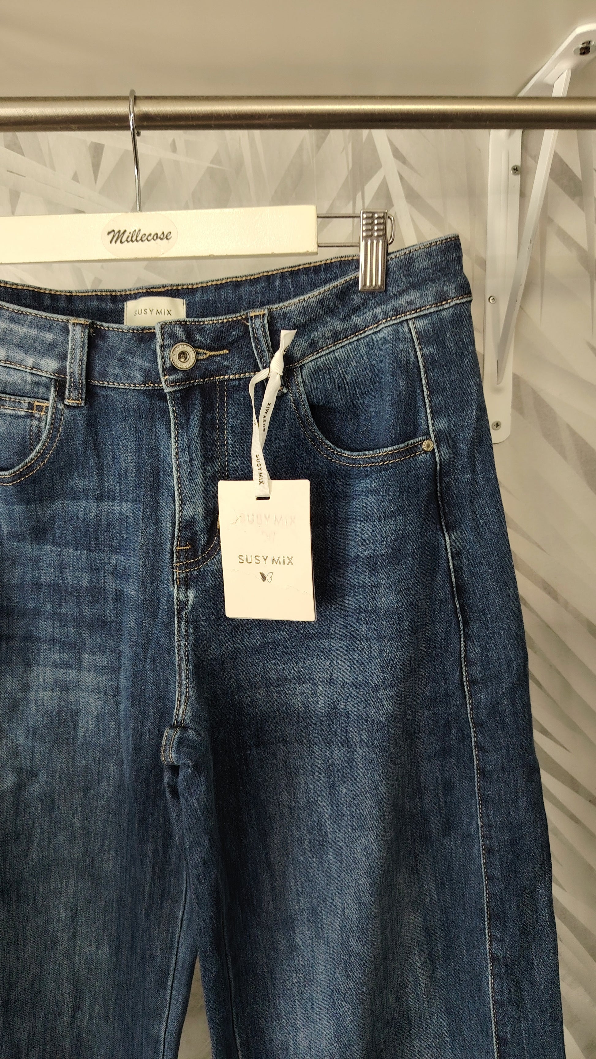 Jeans gamba larga con banda laterale, orlo alto , elasticizzato, cerniera e bottone, cinque tasche